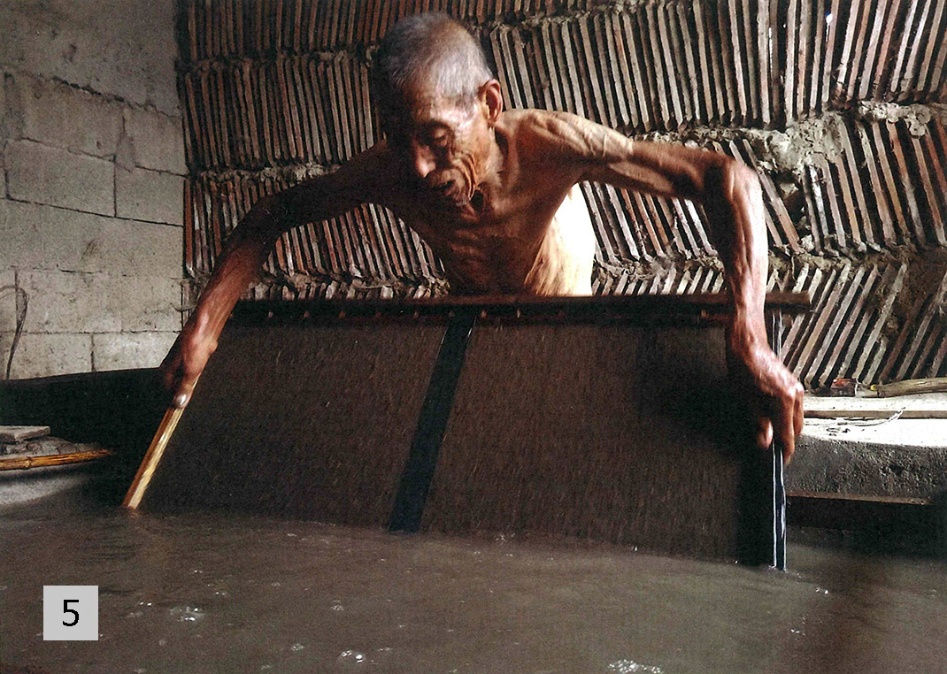 Traditional artisanal papermaking follows has a specific set of production processes, including soaking, cooking, rinsing and sun-bleaching the materials used before they are hand-beat to form the paper pulp to be scooped, pressed, and dried to produce the final product.