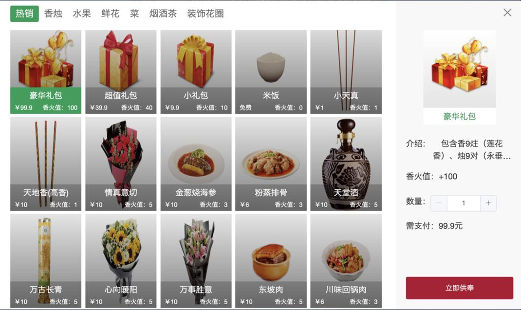 Fig. 2  An online “shop” for digital mourners who wish to pay tribute. There is a very wide range of offerings to choose from, including incense, fruits, flowers and even Chinese delicacies like Dongpo Pork. The more glamorous the offering, the more expensive it is. Each offering has a different “incense value”, a more expensive offering would contribute a higher incense value. Source: jibai.com. Screenshot by author.
