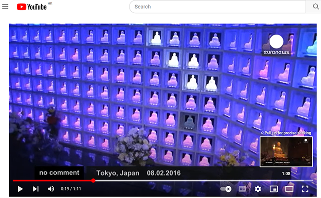 Fig. 3  A screenshot of a video “High-tech afterlife in Japan” produced by Euronews. This high-tech columbarium is situated in a Buddhist temple in Japan. Behind each crystal Buddha, an urn is stored. Mourners would use a card with an embedded chip to turn on light of the specific Buddha where ashes of the deceased are stored.  Source: YouTube, www.youtube.com.