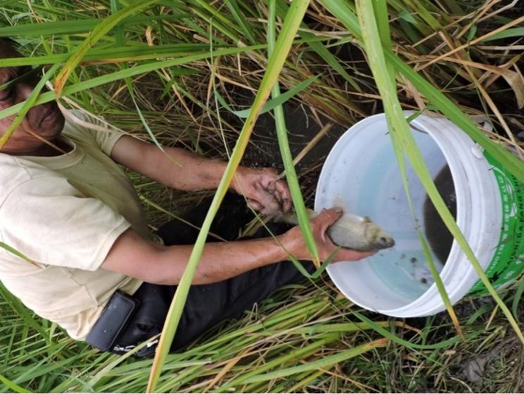 As granaries are made of wood or bamboo, fire prevention is another important concern of farmers. Villagers often build their granaries together right outside their main living area to keep a certain distance from sources of flames. In addition, many granaries are built directly upon fishponds (Fig. 4). Such a design connects to another everyday technology of land use in Guizhou: the rice-fish-duck symbiotic system which cultivates fish, duck, and rice at the same time in rice paddles (Fig. 5). Farmers rear fish seeds in the tank below the granaries and later move the fish fry to paddies after rice transplantation. In this integrated agri-aquaculture ecosystem, fish and duck can enhance water flow and reduce pest and weed, and the excretion of fish and duck can also be natural fertilizer for rice. The Food and Agriculture Organization of the United Nations have listed Guizhou Dong’s rice-fish-duck system as a GIAHS (Globally Important Agricultural Heritage System) in 2011.