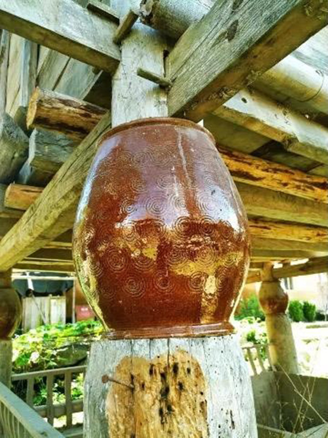 Fish tanks below the granaries also help to stop another main enemy of stored grain: rats. Besides the tanks, there are also other features designed to prevent rats. For example, in Yao villages, there is a kind of he granary called tanjiao cang (罈腳倉, jar-footed granary) with ceramic jars covering the four wood pillars (Fig. 6). These specially made jars wear slippery ceramic glaze to stop rats from running along pilings. Smooth stone, wood discs or iron sheet are also used in some areas for rat prevention (Fig. 7).