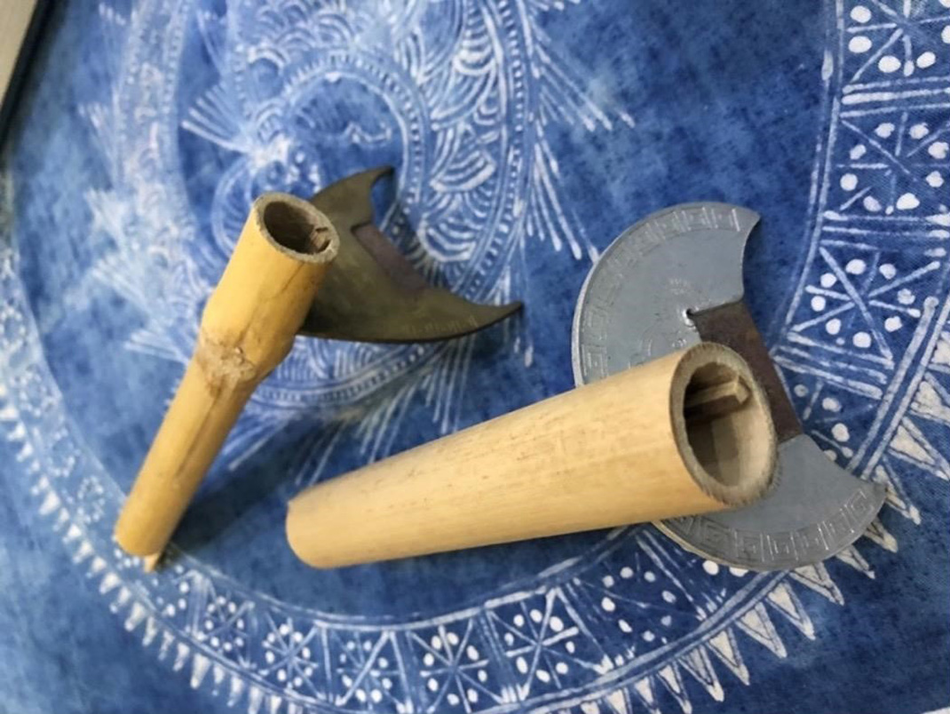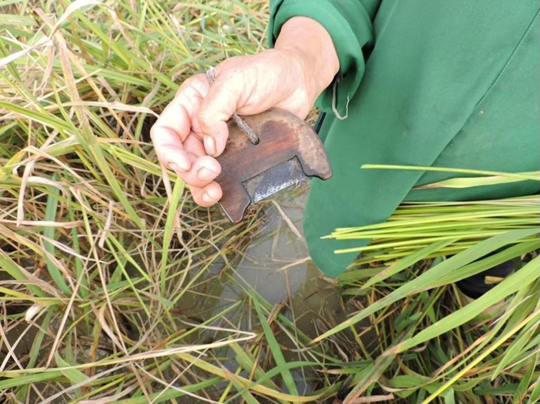 In Southwest China’s Guizhou province, granaries are known as he cang (禾倉). In Chinese, granary is often called liang cang (糧倉). Both he and liang could mean grains or cereals. However, in Guizhou, he often refers to a particular category of grains. He is not a biological category according to the current taxonomy. Instead, he generally means glutinous rice (sticky rice, nuo 糯), or those that have to be harvested through two special processes: zhai he (摘禾) and he liang (禾晾).[1] As he is hard to be threshed, these two processes are essential. During the harvest, farmers cut the he ears one by one with a special tool called zhai he knife (摘禾刀) (Fig. 8, Fig. 9, Fig. 10). This purpose-built tool has a half-moon-shaped blade which is designed to cut individual he ear. The procedure of he liang (hanging out and dying he) is also required. During he liang, grain ears are bundled up and hung on he liang shelves (禾晾架) (Fig. 11, Fig. 12). After drying the ears in the sun for about 20-30 days, he ears would be stored in granaries. Farmers do not thresh and dehull the grains until the time of cooking.