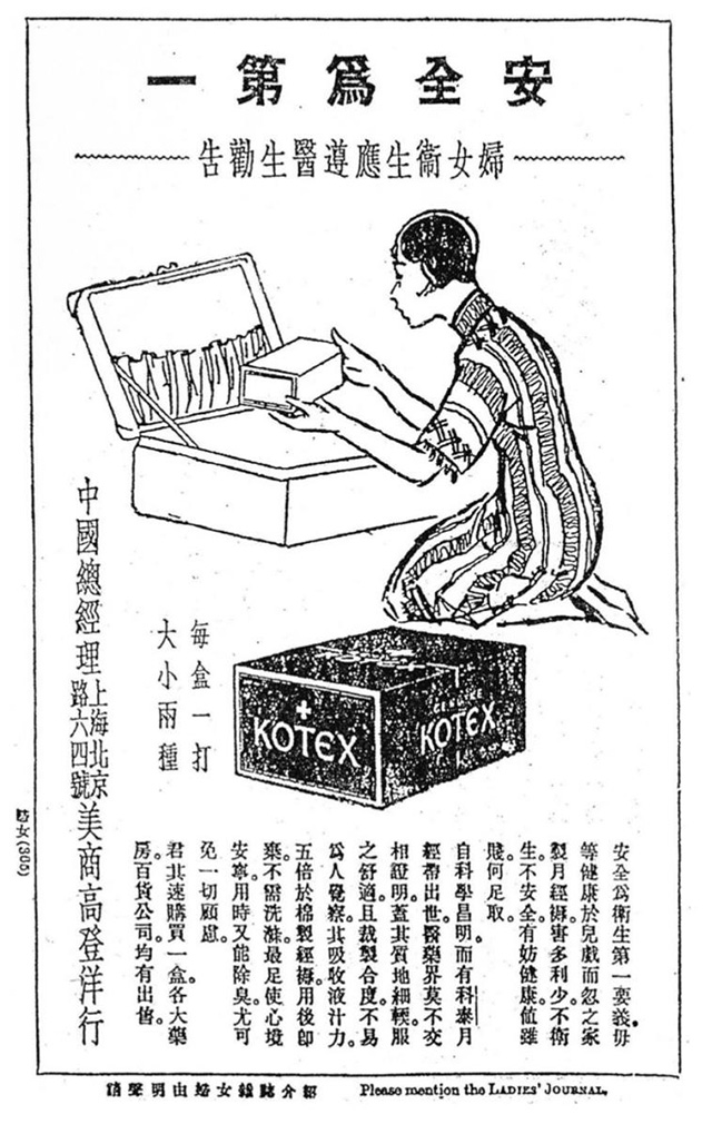 It was sooner than imagined that disposable menstrual pads entered the market of China in the Far East. By 1928, magazine advertisements of Kotex could be seen in popular Shanghai magazine Ladies’ Journal (婦女雜誌).[3] In later years, advertisements of other menstrual pad brands, including Modess by Johnsons & Johnsons and locally produced Comfort Sanitary Napkin & Belt (康福衛生棉衛生帶) could be found in the same magazine. But how was sales of these products? Expectedly, since it was mentioned earlier that menstrual cloth was mostly used among Chinese menstruators until the 1980s, sales of disposable menstrual products were probably disappointing. In her article on menstrual hygiene in contemporary China, Chou Chun Yen gave two speculative reasons: 1. It would have been too embarrassing for one to purchase menstrual pads in person; and 2. It was way too expensive.[4] In fact, the first issue was bothering menstruators across the Atlantic as well – sales of Kotex improved only after women could make a purchase by self-service: putting money in a payment box and taking their Kotex from the counter without having to speak to the shopkeeper.[5] It was likely that it was as difficult for Chinese menstruators across the ocean. But economic reasons might be an even larger factor. While menstrual pads were getting cheaper with the use of cellucotton locally, they were likely far from affordable in China as imported goods. The magazine ads also provide us a glimpse into the possible target customers of the pads: the fact that the ads were published in Ladies’ Journal, a magazine targeting upper-/middle-class Shanghainese women; that women portrayed in the ads were all modern-looking “fashionable” ladies (時髦女子) say a lot about who was targeted and was capable of using these newly imported 舶來品 goods.