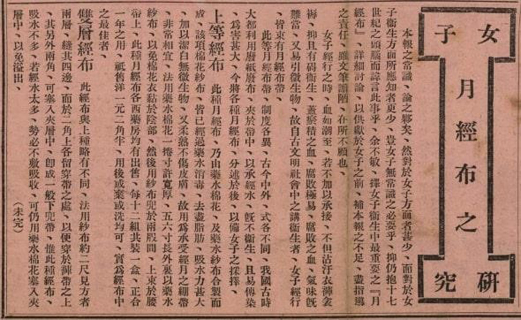 The introduction of menstrual pads to China does not only reveal the life of the Shanghainese upper and middle class in the most prosperous city in China of the time. It manifests a paradigm shift of the Chinese scientific and medical arenas in their views of women’s biology, female hygiene and menstrual health, and their relationships with national survival as well as the individual menstrual experience.