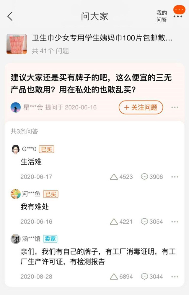 In August 2020, a post on Weibo sparked heated debate on the price and quality of disposable pads in China. The original post by Weibo user Shangwang hairen 上網害人 showcases screenshots of a product page on Taobao and a thread of discussion in the product review section. The post is captioned “about menstrual pads, I only found out by accident that there are packageless menstrual pads for sale”, and the product featured in the screenshot is a bag of 100 menstrual pads put in a transparent zipper bag sold at 21.99RMB. What stirred public opinion was the second screenshot showing customer reviews, where a person has warned others of the potential risk of using such a product: “I suggest getting pads that are branded, how can you get anything this cheap for your private parts?”, only to have received replies like “life is tough” and “I have difficulties”.