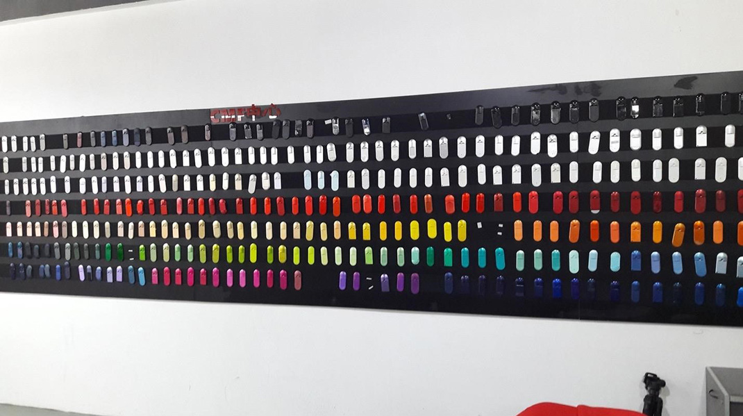 Fig. 10  Library of phone cases in the industrial design workshop. This “library” displayed the available colours and case designs available locally in Shenzhen. A working designer could consult the library to colours and shapes appropriate for a particular product design. Photo by author.