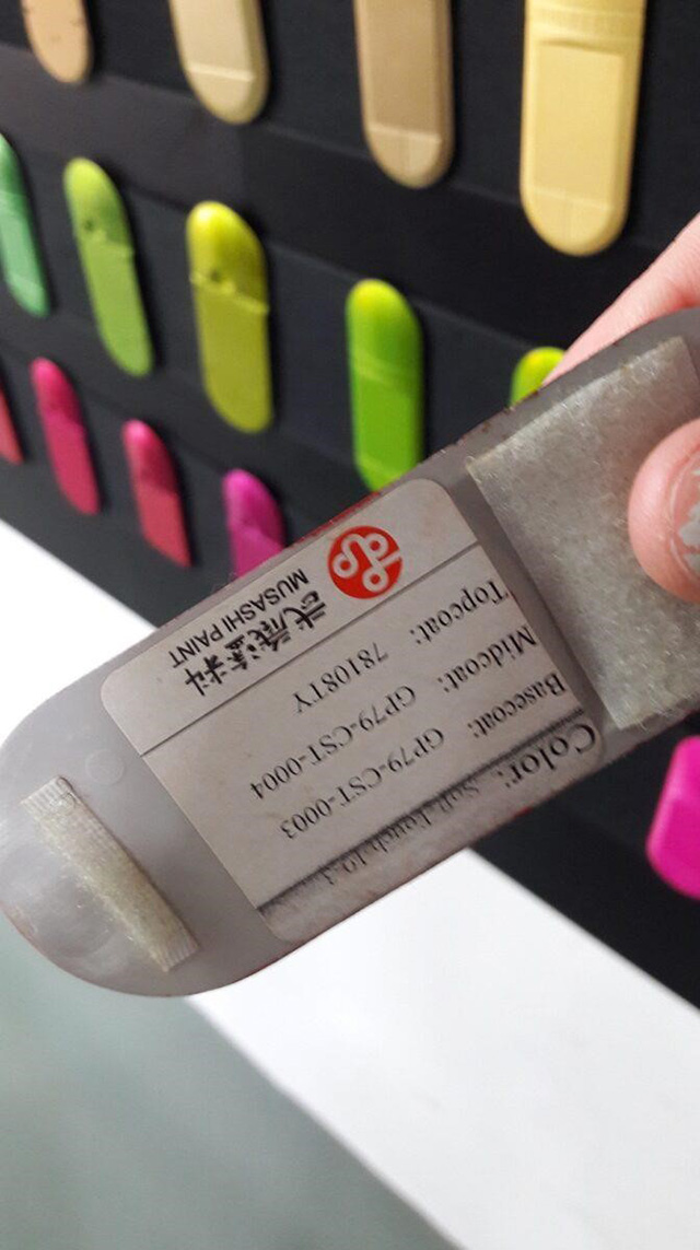 In some cases, customers will make initial contact with industrial designers. The designers will help them to refine their designs, link them to suppliers for the materials they need, and connect them to factories that can perform the required assembly. Figure 10 shows a library of mobile phone cases illustrating all the different colours and textures that are locally available. The reverse side of each case (Figure 11) displays a serial number linking the colour and texture to a particular supplier that can provide that specific material.