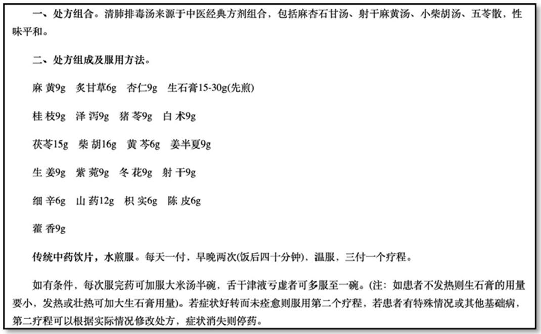 In contemporary practice, classical, established formulae are conventionally used by TCM doctors as bases for their prescriptions, in other words they are subject to adjustments and adaptations according to the specific conditions of each patient. On February 6, 2020, the NHC and NATCM recommended a formula called qingfei paidu tang (清肺排毒汤, “decoction for clearing lung-heat and detoxification”), a new formula that combined five established formulae from classical medical works. This formula was also added to the sixth edition of the Scheme (released February 18, 2020) as the first recommended formula that could be used to treat COVID-19 patients exhibiting different patterns and conditions.
